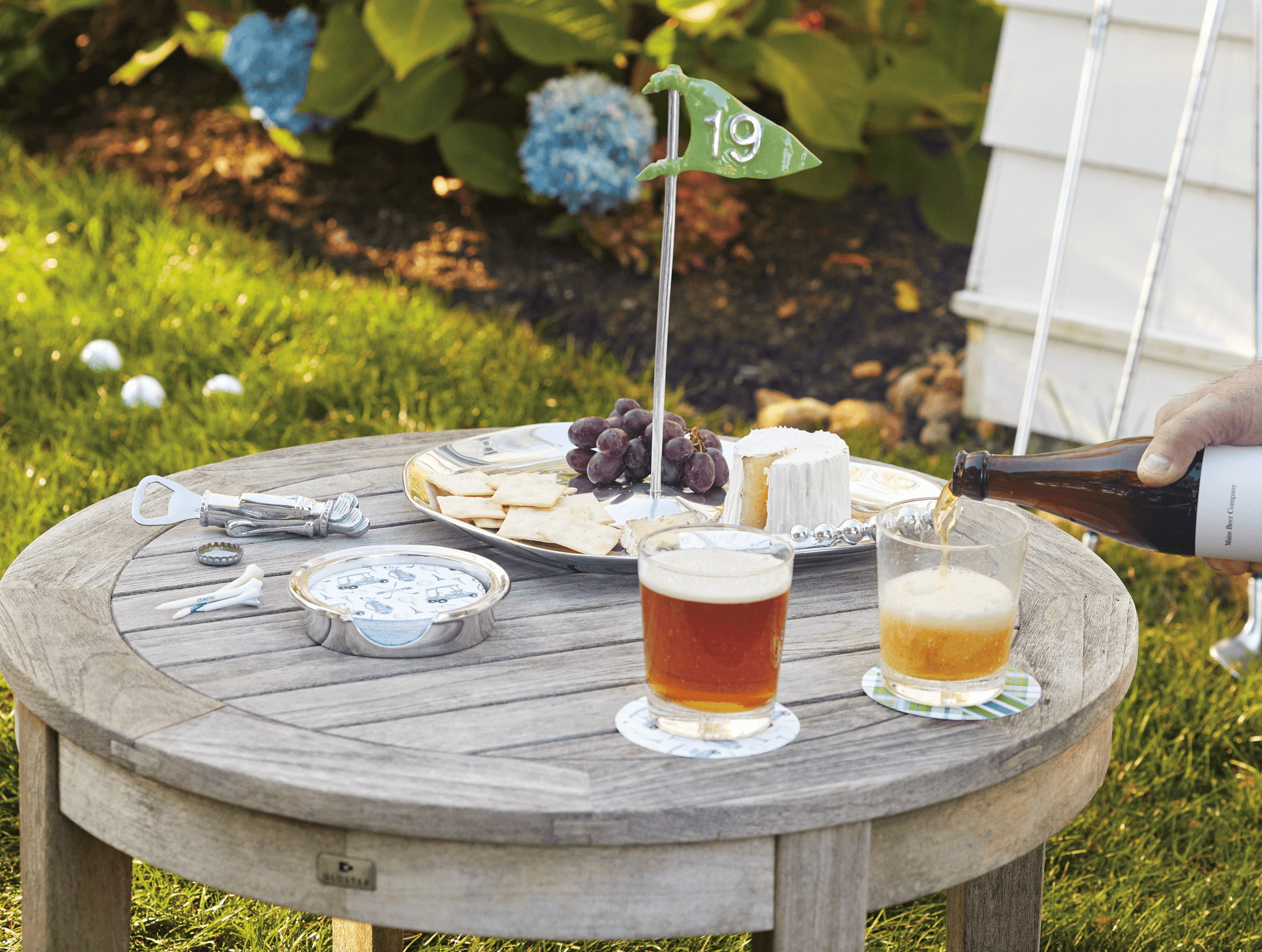 The 19th Hole Server proudly displays the iconic 19th hole flag, a symbol of relaxation and camaraderie after a round of golf. The enamel green flag adds a vibrant touch that stands out on any table. Handcrafted from 100% recycled aluminum.