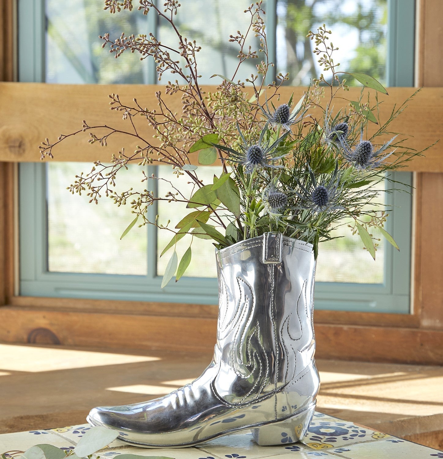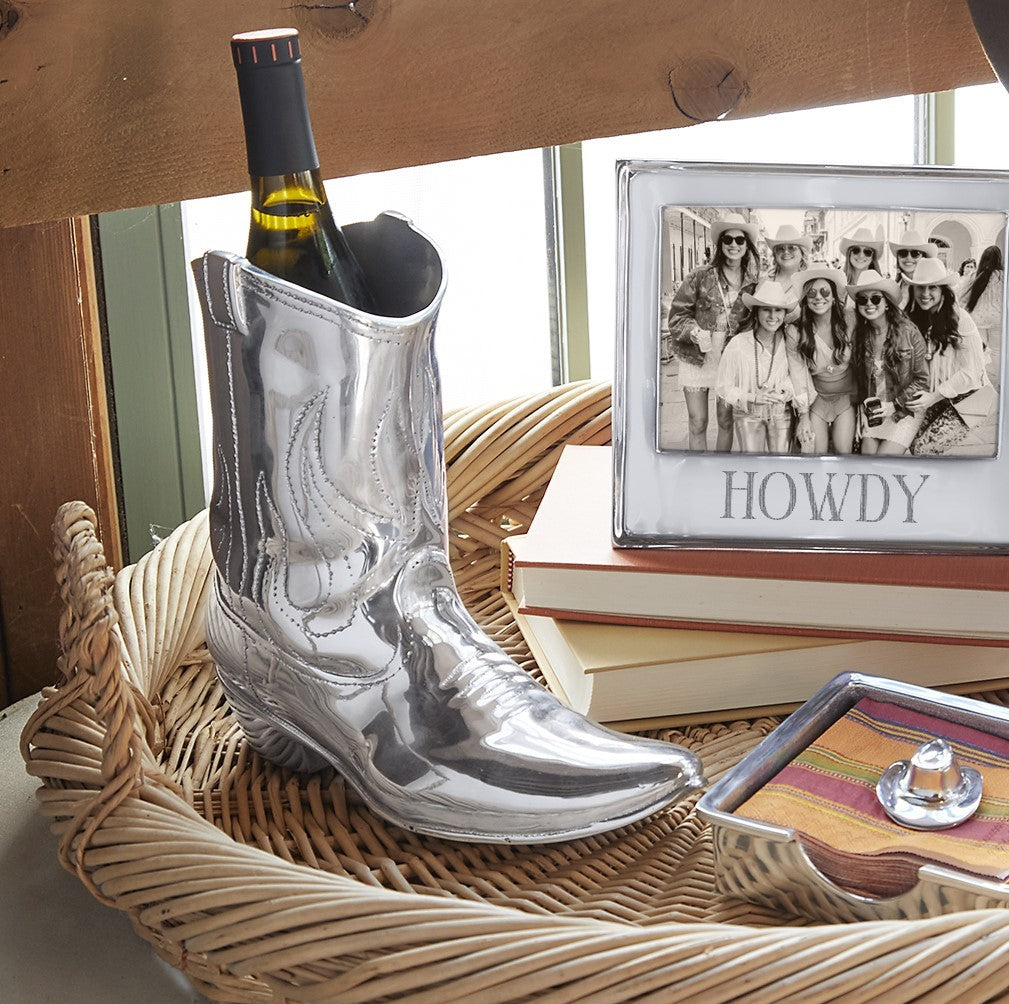 Kick up your entertaining game with our Cowboy Boot Wine Cooler, a true statement piece from the Wild West Collection. Handcrafted from 100% recycled aluminum showcasing intricate boot detailing. Aside from holding most standard wine bottles, this piece also doubles as a unique vase for faux flowers, making it a standout decor piece even when not in use.